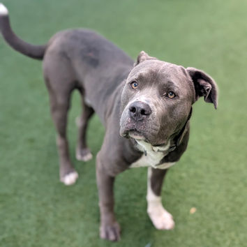 Baby is, well, a giant baby! This big boy is 80 pounds of goofy love. Great on leash and happy to play with stuffies in the yard, he loves a good cuddle session and, despite his size, tends to think of himself as a lapdog. Happy and easygoing, Baby loves people and other dogs (he may love cats a bit too much and should go to a home that's feline free). All this boy wants is a forever family that will shower him with pets, snuggles, a soft bed, and some stuffed toys he can throw around.